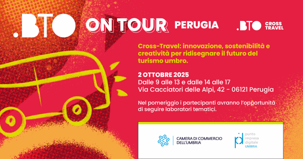 Si svolgerà a Perugia il prossimo giovedì 2 ottobre, presso la Camera di Commercio dell’Umbria, l’incontro “BTO On Tour”, un’iniziativa di formazione itinerante di BTO – Be Travel Onlife.